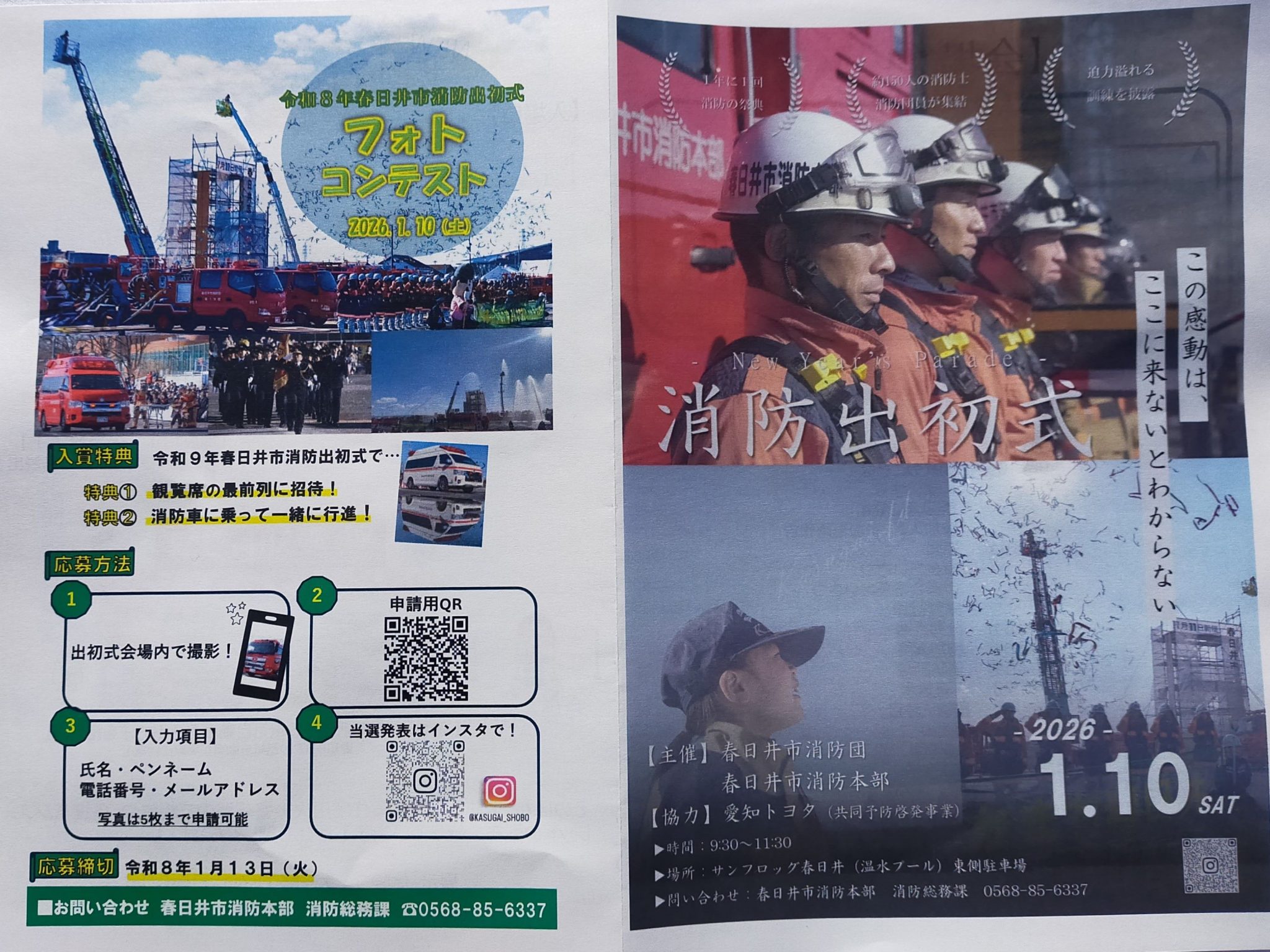 サンフロッグ春日井にて、消防出初式が開催されました。9時30分より開式のことばで始まり、各地域の消防団員、中部大学消防団、消防署職員の皆様が整列され、会場には多くの市民が参加されました。多くの種類の消防車や救急車が整列し …