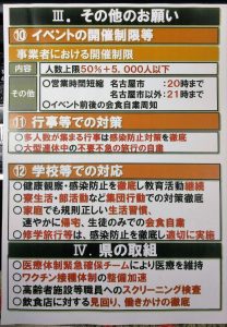 4月20日~5月11日まで第4波のコロナ抑制に向け「愛知県まん延防止等重点措置」の対策を取ることになり、急きょ21日に臨時議会が開催されました。営業時間の短縮の要請等に応じる事業所に対し、「愛知県感染防止対策協力金実施分」を交付するため、492億5570万円余の予算が必要になります。この他に飲食店を見回る活動予算が7億5970万円余が新規として計上されました。