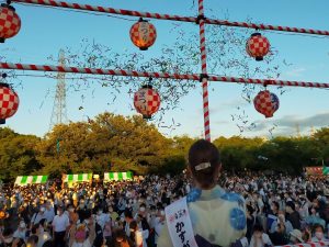 お盆踊りはお揃いのゆかたを着られた踊りのお師匠様が、やぐらの上でお手本を見せてくださいます。それを見ながら多くの方々も踊りの輪に参加し、私も入らせていただき踊りました。「どっこいせ、木曽節、郡上節、炭坑節、キヨシのズンドコ節、春日井よいとこ」の曲が流れ、さくら太鼓や藤太鼓の皆様が音楽に和太鼓の音色を合わせていただいて、とても盛り上がりました。