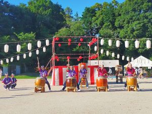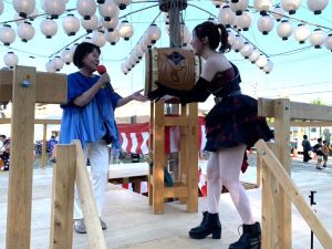 早速、盆踊りが始まり、踊りの先生方と共にやぐらの上で参加させていただきました。「春日井よいとこ」の定番の曲で始まり、新曲もあってわからなかったのですが、先生の踊りを見ながら必死でついていきました。次は何の曲かな?と楽しみながら踊っていると、あっという間に1時間が経ってしまい、前半の部全てに参加させていただきました。
