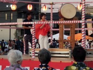 今年の夏祭りのスタートはJA不二コープで開催された盆踊りでした。日中は猛暑で、この暑い中、踊られる方々は大変だと思いましたが、始まるころには丁度夕日が家々に隠れ、風も吹いてきて心地よいお天気になりました。JA組合長、丹羽ひでき衆議院議員、石黒直樹市長、そして私と順にご挨拶でした。「ご家族やお友だちの皆さんと、夏の夜を楽しみましょう。」とお話しました。