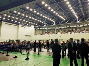 9月22日に告示された総裁選挙日程は、23日に党本部で行われた共同記者会見、青年局・女性局公開討論会を経て、24日には日本記者クラブ主催の公開討論会と地方演説会が東京・秋葉原で開催されました。そして26日の今日、地方演説会2会場目となる名古屋のIGアリーナにて、演説会が開催されました。県連ではどれくらいの人が集まってくださるのか不安でいっぱいでしたが・・・
