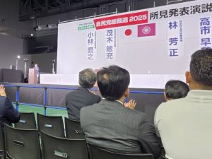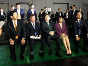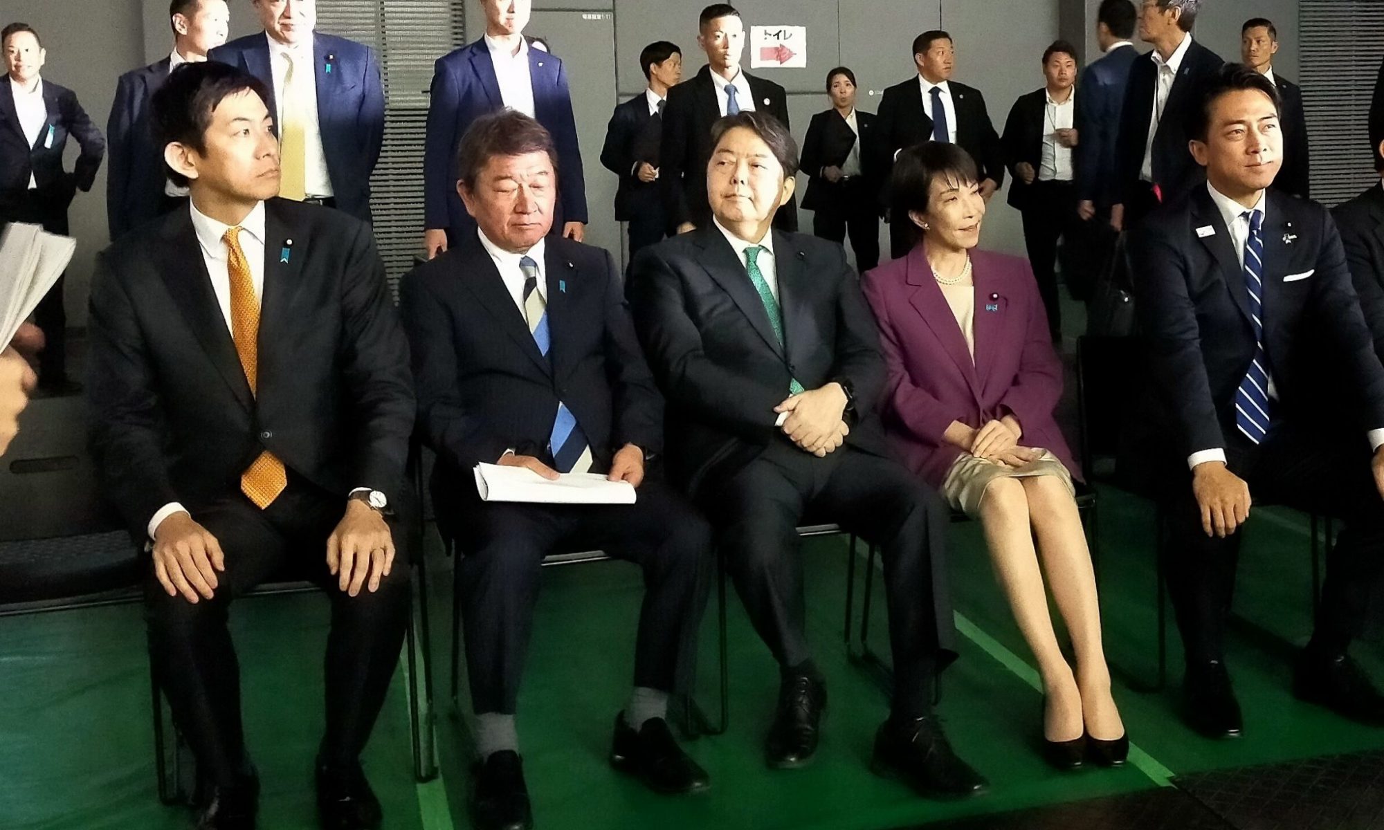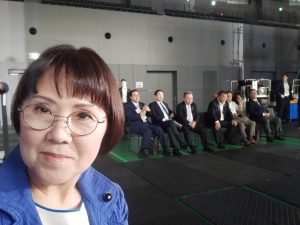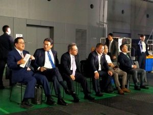 途中から青年局長にバトンタッチ。舞台裏で控えていると、小林鷹之氏、茂木敏充氏、林芳正氏、高市早苗氏、小泉進次郎氏の5名の候補者の皆様が登場され、出番を待って見えました。すでに会場内はいっぱいの観客で、椅子を足していくのですが、ついにスペースが無くなり会場に入れない人たちが外であふれていたそうです。5氏の方が壇上に上がれると大きな拍手が湧きました。