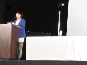 夕方5時30分の開始時間が迫ってくると、会場の席が見る見るうちに埋まってきて、すでに1階席は満席となり、2階席に座っていただきました。時間となり最初に「自民党愛知県支部連合会演説会」として、愛知県連所属の各選挙区支部長と国会議員による演説会から始まりました。そのスタートを私が司会者として担当させていただきました。会場いっぱいのお客様にドキドキ。