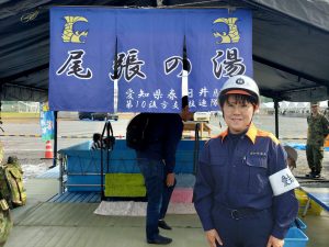 グラウンドの周りにはテントが張られ、様々な体験コーナーが設置されました。安全・安心なまちづくりボニター、アマチュア無線クラブ、赤十字奉仕団、社会福祉協議会、動物愛護センター、災害ボランティアコーディネーター等々、もしもの災害に備えて、共助の体制が整っています。自衛隊が設置した入浴施設もあり、足湯で入られている方もみえました。