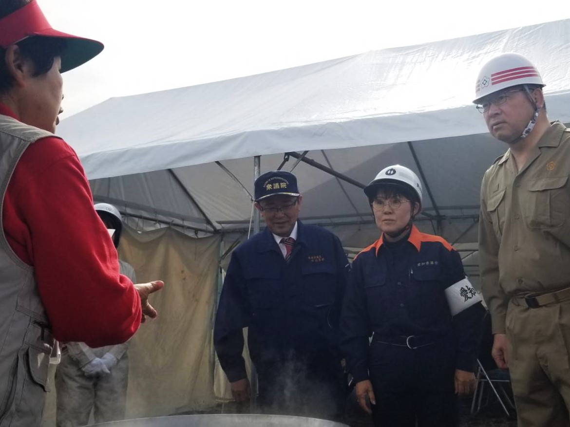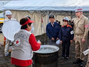 赤十字奉仕団の皆様が、袋にお米と水を入れて大鍋で煮てみえました。ご飯が出来るそうです。石黒市長や丹羽代議士と共に「美味しそうですね。」とお話すると、「出来上がったらお持ちします。」とおっしゃっていただき、本当に訓練終了後にご飯をいただき、持ち帰って美味しくいただきました。いつ起きるかわからない南海トラフ地震に向けて、常に災害意識を持ち続けなければと思います。