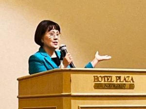 最後に日本のジェンダーギャップについて話し、女性初の総理が誕生したことで、女性の活躍に拍車がかかります。これから女性の就労率があがり、子育て支援が先になって、幼稚園経営は更に厳しくなっていく現状をどうしていくのか。幼稚園連盟の結束力で、国や県への提案をしていくことがさらに必要となるので、しっかり応援していきますとお話しました。