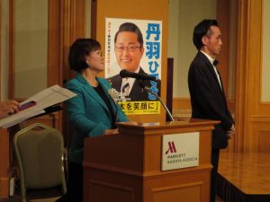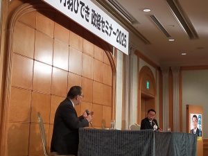 その後、春日井市と瀬戸市の市議会議員の皆様を紹介し、その後対談形式で講演会が開催されました。今回はCBCテレビ「ゴゴスマ」でご活躍中の政治ジャーナリスト角谷浩一をお迎えし、舞台にて丹羽代議士と今の政治状況について、お話ながら進められました。角谷講師は東京タイムズ、週間ポスト等の編集者としてご活躍後、政治ジャーナリストとして全国各地でご講演活動をされてみえます。