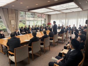 議会終了後、尾張東西地区の議員が揃って知事公館に移動し、大村知事に令和8年度の当初予算要望書を渡しました。春日井市の要望は「北尾張中央道の整備促進、小牧春日井線の整備促進、春日井各務原線の整備促進、都市計画道路河北線の整備促進、都市計画道路一宮春日井線、都市型水害に対する治水対策の促進」をお願いしました。迅速に事業が進むように要望してまいります。