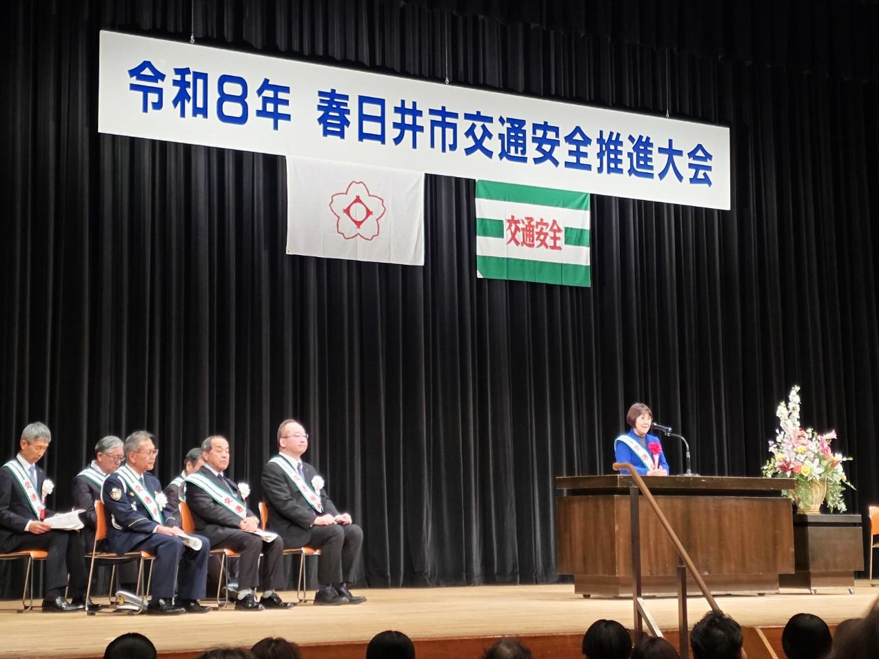 今日は春日井市民会館において、「令和8年 春日井市交通安全推進大会」が開催されました。交通安全に協力されている方々や団体、交通安全イラストに応募され、選ばれた優秀な小中学生の皆さんの表彰式も行われました。はじめに会長であります石黒市長よりご挨拶がありました。春日井市の交通事故状況や死亡者数について報告があり、交通事故防止にご協力をお願いしたいと話されました。