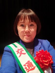 「交通安全にご協力していただいた個人や団体の皆様、ご尽力に心より感謝です。皆様のお蔭で、死亡者数が減ったと思います。今回のイラスト作品を見ると、スマホや自転車に関するものが多く、時代の流れを感じます。特に冊子の表紙の絵は、自転車の罰則についてわかりやすく描かれています。ヘルメット、スマホ、イヤホンなど違反にならないように気をつけましょう。またお子さんは大人の運転を見ているので、私たちが交通安全のお手本になるよう気をつけたいですね。」とご挨拶しました。